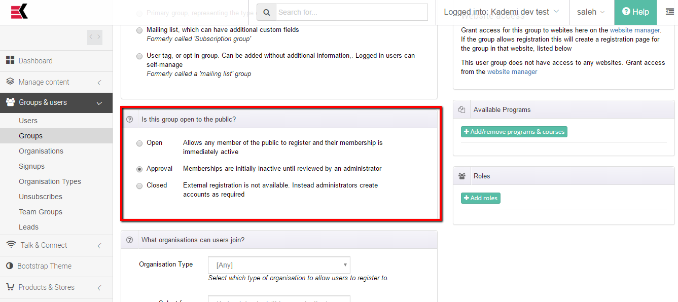 - Open– all users which are accessing signup page will be able to register into this group and became an active member of it