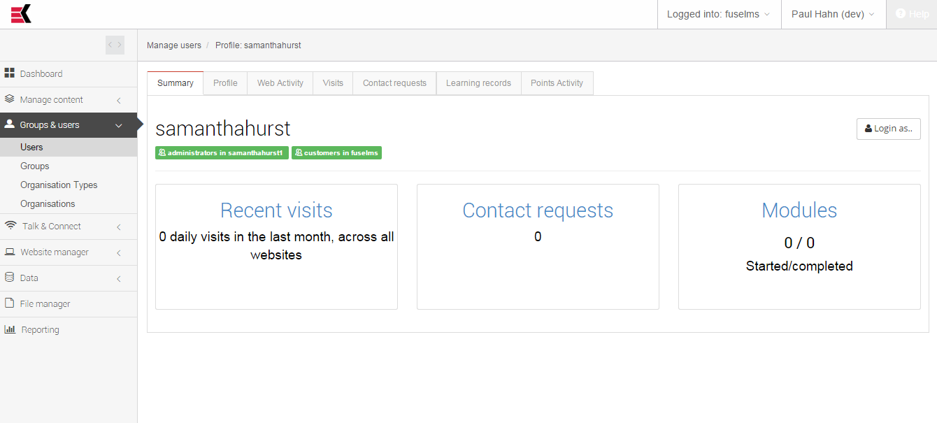 - Modules – counts of started and completed modules by this user; click on it leads you to sixth tab