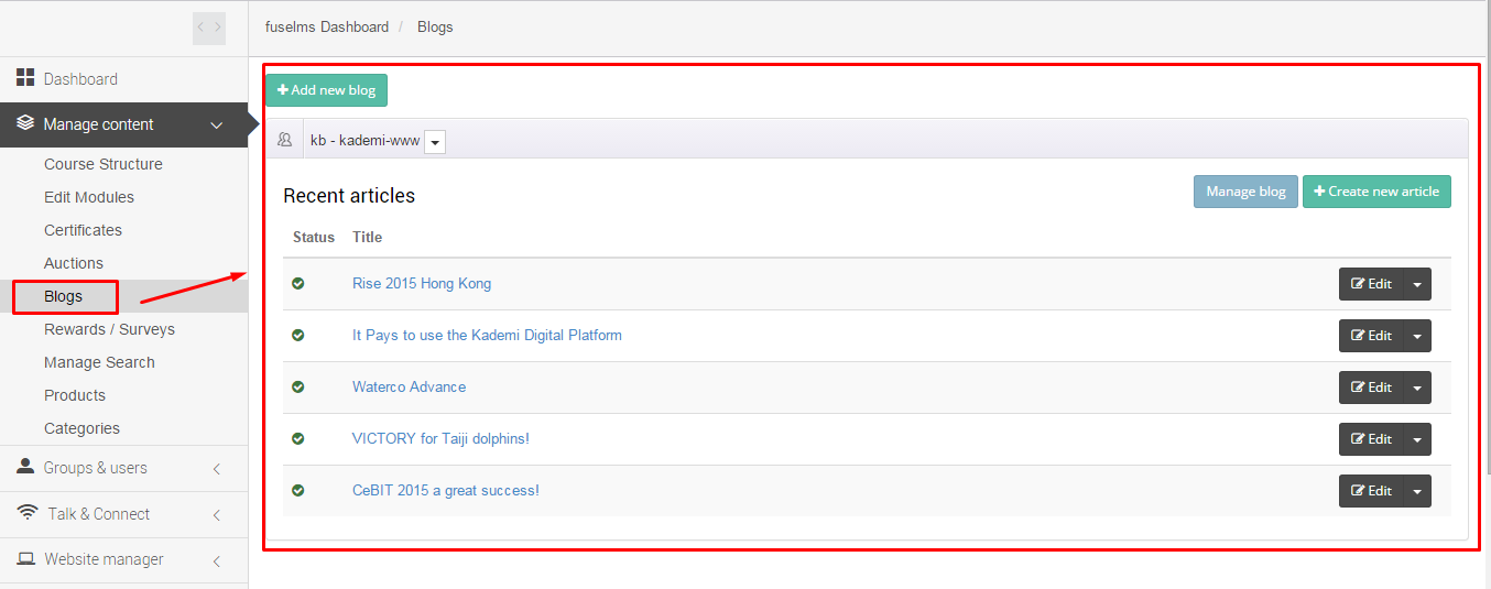 This page is designed to manage your Kademi account blogs.