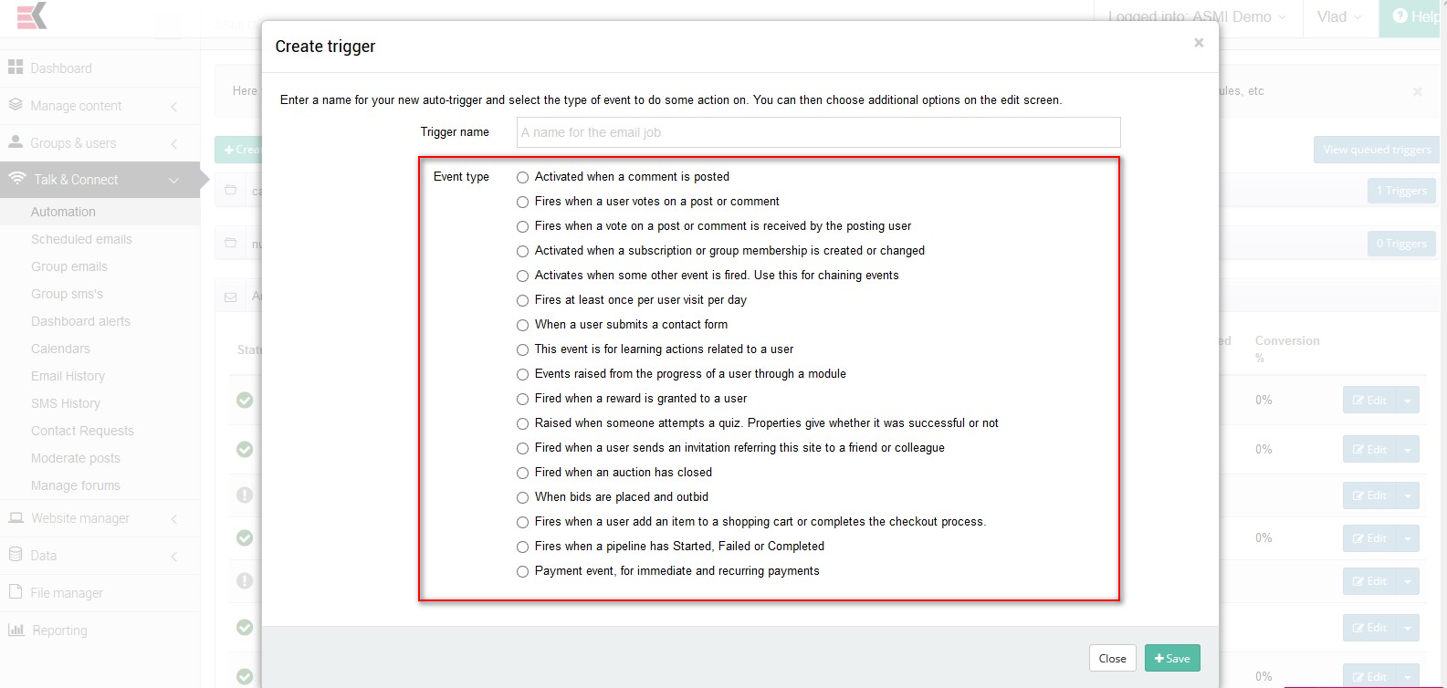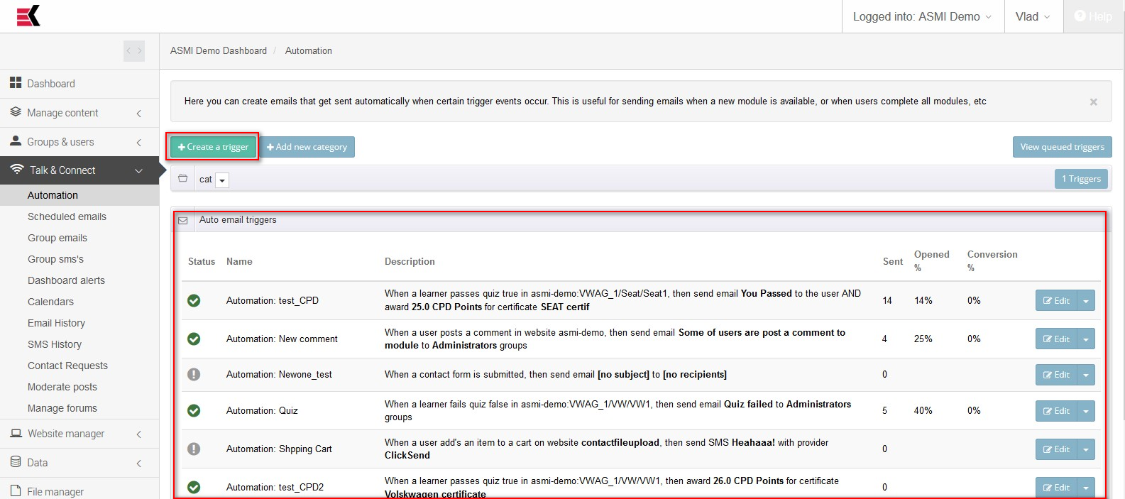 Kademi has a powerful tool to automate some usually actions based on a specific user interactions. There are numerous triggers, which helps to create flexible conditions in the system, as well as actions, which are triggering as a reaction on the user interaction. The simplest example is automation of email sending when user is registering in some specific group or for example, user posts a comment in some specific forum.