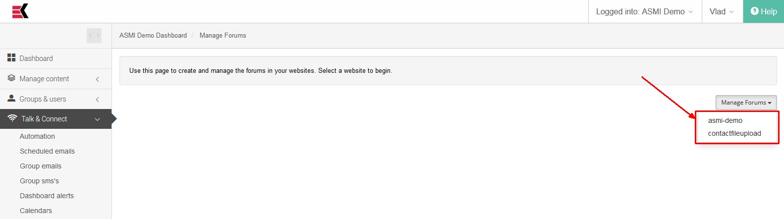 When accessing a page you will be prompted to select website first to begin managing of the it’s forums. It could be done by clicking drop-down list on the right side of the screen.